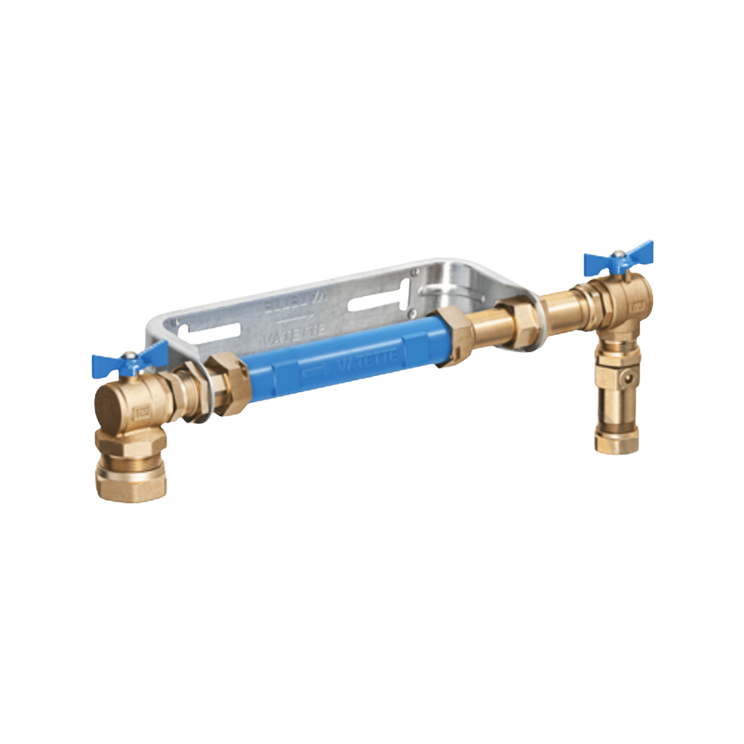 Vattenmätarkonsol med passbit, vinkelkulventiler och med kontrollerbar backventil.